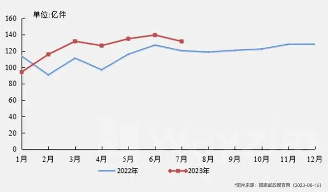 國家郵政局監(jiān)測數據顯示,2023年1月~7月,郵政行業(yè)寄遞業(yè)務量累計完成873.7億件,同比增長12.8%。其中,快遞業(yè)務量(不包含郵政集團包裹業(yè)務)累計完成703.0億件,同比增長15.5%。2023年郵政行業(yè)寄遞業(yè)務量較2022年顯著提升。